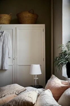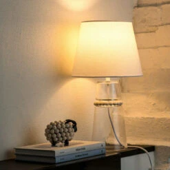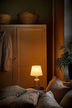 Aarikka Nuppu pöytävalaisin on lasinen lamppu, joka tuo kotiisi eleganttia ilmettä. Runkoa kiertää aito Aarikkalainen puuhelmikranssi. Valaisin toimitetaan ilman valonlähdettä, sopiva valonlähde on E27 kantainen lamppu. Varjostin on ihanaa lämmintä valoa tuova pellavavarjostin. Jalan halkaisija on 13 cm ja varjostimen 25 cm.
