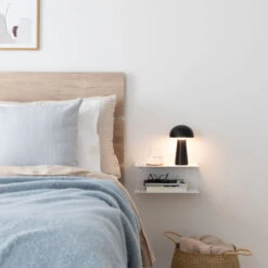 Minimalistinen ja tyylikäs Avignon yöpöytä 1-laatikolla. Yöpöytä kiinnitetään suoraan seinään, jolloin se ei vie lattiatilaa. Laatikko liukuu sulavasti metallikiskon ansiosta. Materiaali on maalattua MDF:ää.