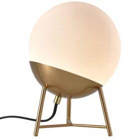 Kauniisti valaiseva Chelsea pallomainen pöytävalaisin. Valaisimessa valkoinen pallomainen lasikupu messinkisessä jalkaosassa. Valaisimessa on kangaspäällysteinen johto, jonka pituus on 150 cm.