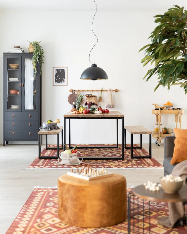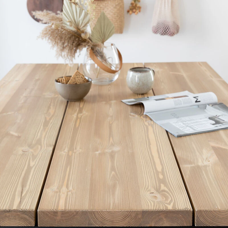 Näyttävä, rustiikkinen mutta ennen kaikkea kestävä Ruska lankkupöytä pysyy paikoillaan isommankin kuorman alla. Kolmesta tuhdista mäntylankusta koostuva kansi yhdistettynä kestävään teräsjalkaan tekee pöydästä ihastuttavan. Kansi on tehty kolmesta leveästä lankusta, joissa on harjattu ja petsattu pinta. Kannessa näkyy kauniisti puun syyt ja kuviointi, joten pinta ei ole tasainen. Pöytään on helppo yhdistää erilaiset tuolit ja kokonaisuus on valmis. Pöydän jalat ovat pulverimaalattua terästä, joten se kestää myös ulkokäyttöä.