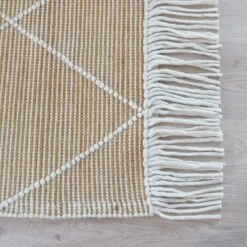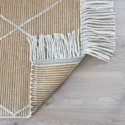 Upea käsinkudottu villamatto, jossa kaunis vinoruutukuviointi ja hauskat, paksut villahapsut. Maton pehmeä nukka tuntuu miellyttävältä jalan alla. Villa on materiaali, joka hylkii luonnostaan likaa, minkä vuoksi villa on helppohoitoinen ja kestävä materiaali.